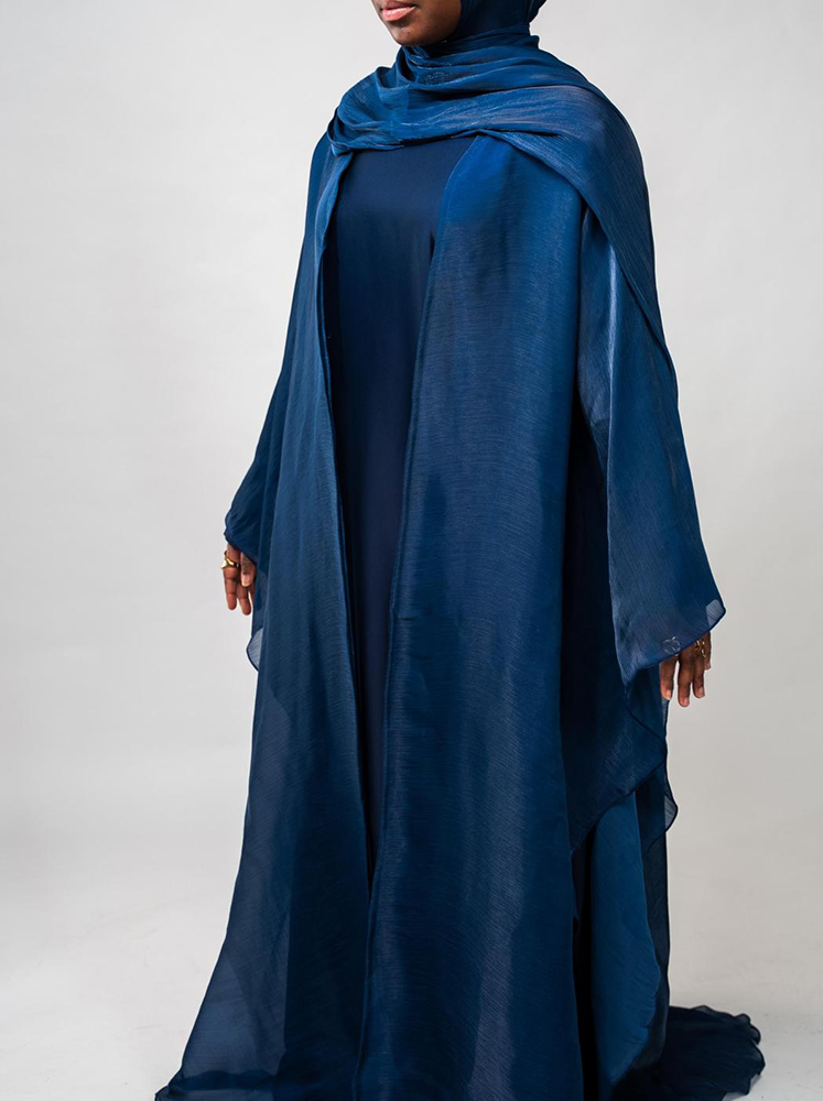 ⁠La abaya Aamira est une tenue en organza premium disponible en bleu nuit ou beige, accompagnée d’une sous-abaya à manches longues en nidah assortie, incarne l’élégance et le raffinement, idéale pour les grandes occasions ou un style distingué au quotidien.